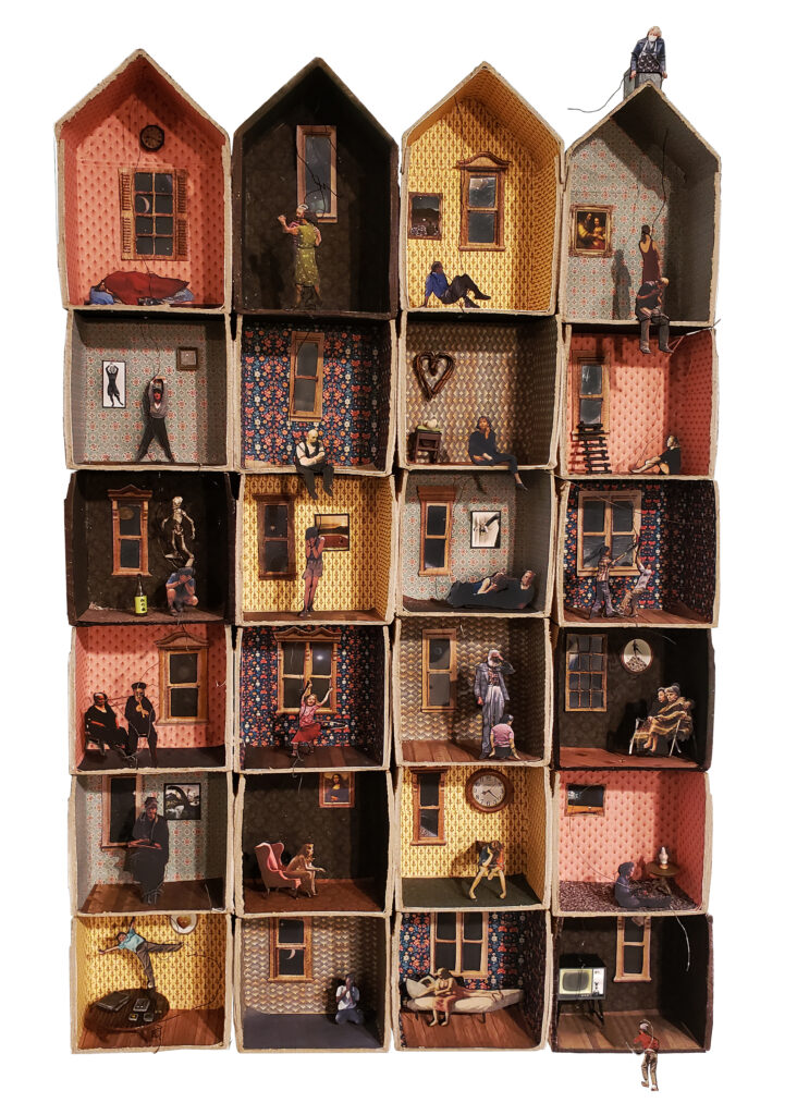 “Mi trabajo se refiere principalmente a cuestiones de la vida diaria y la memoria personal yuxtapuestas a las fuerzas más grandes del universo y la historia humana. Completé Refugio en los últimos seis meses mientras me refugiaba en casa durante la pandemia de COVID-19. Mi intención era crear la sensación de ser parte de una comunidad a la que se le recomendó que se quedara en casa durante esta crisis de salud. Esta pieza tiene como objetivo reforzar nuestra humanidad compartida, con cada uno de los espacios de la obra representando a alguien haciendo lo mejor que puede dadas las circunstancias. A lo largo de mi carrera como artista, he traducido mis ideas a una variedad de medios (fotografía, libros, instalación, video, escultura y arte público), todos los cuales hacen uso del fotomontaje. Otro hilo común a lo largo de mi trabajo, independientemente del medio, es el que llamo «arqueología visual». El proceso comienza en mi estudio con una exploración del mundo a través de una extensa investigación, tanto visual como escrita. Esta investigación se extiende luego a la sala o espacio expositivo, invitando al espectador a descubrir el significado de la obra profundizando en sus imágenes y asociaciones, tal como lo hice yo al crearla”.
