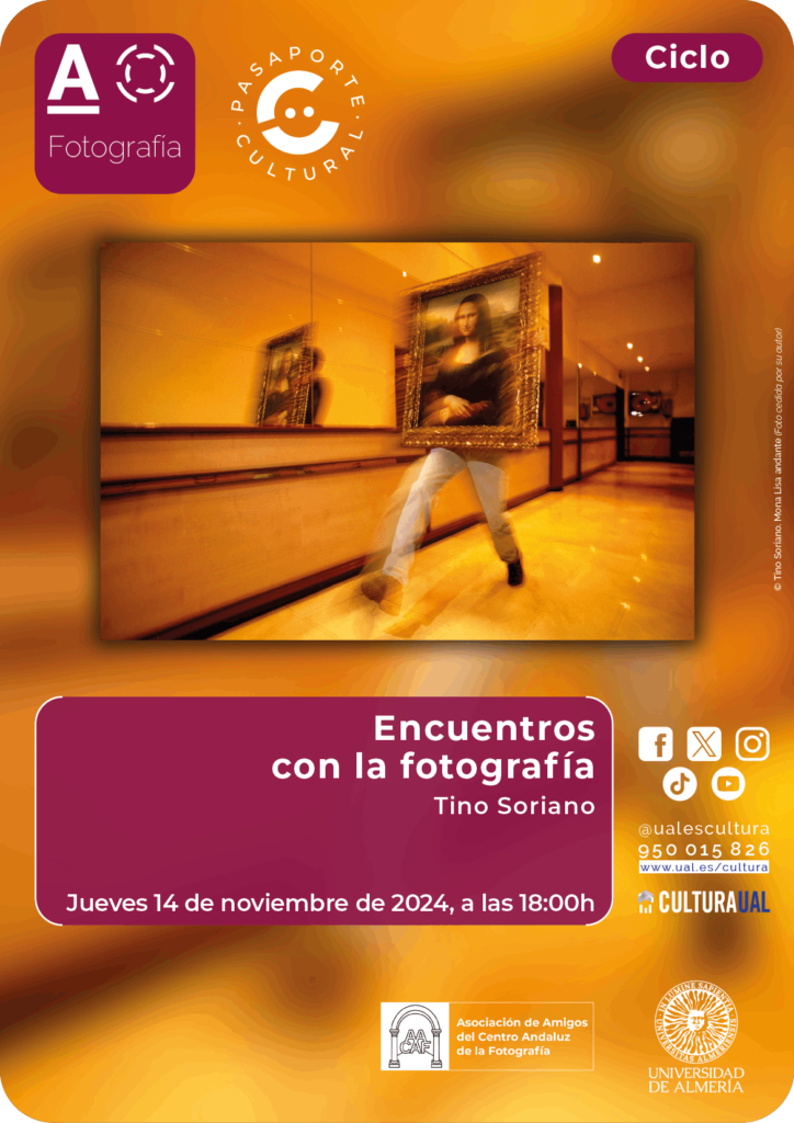 La Asociación de Amigos del Centro Andaluz de la Fotografía y la Universidad de Almería (Secretariado de Gestión y Promoción de la Extensión Universitaria) organizan los “Encuentros con la fotografía”, un cuarto ciclo de diálogos con destacados miembros de la comunidad fotográfica nacional en los que se pretende mantener una conversación en torno a la fotografía en general, al trabajo que cada uno de ellos ha venido desarrollando y a las opiniones que tienen sobre ella, su actualidad y su futuro, sin guion previo y con la posibilidad de interactuar con los invitados por parte de las personas inscritas.