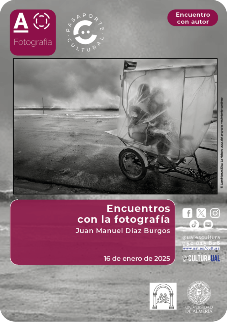 Juan Manuel Díaz Burgos es el siguiente invitado al ciclo de diálogos organizados por la Asociación de Amigos del Centro Andaluz de la Fotografía y la Universidad de Almería con destacados miembros de la comunidad fotográfica nacional en los que se pretende mantener una conversación en torno a la fotografía en general, al trabajo que cada uno de ellos ha venido desarrollando y a las opiniones que tienen sobre ella, su actualidad y su futuro, con la posibilidad de interactuar con los invitados por parte de las personas inscritas.